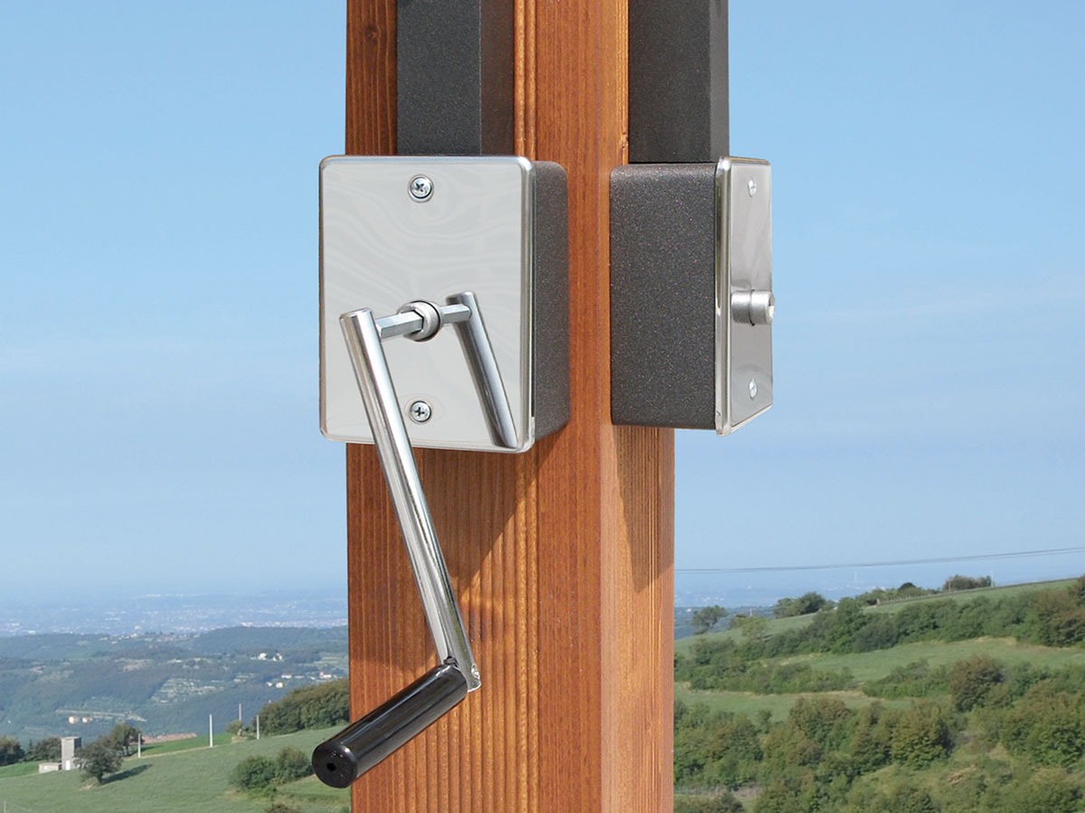 STRUTTURA: palo decorato con scanalature in essenza di toulipier 142x142 mm, bracci decorati con scanalature in tubolare di alluminio 92x92/sp.2 mm; stecche a sgancio rapido 36x18 mm; stecche antivento