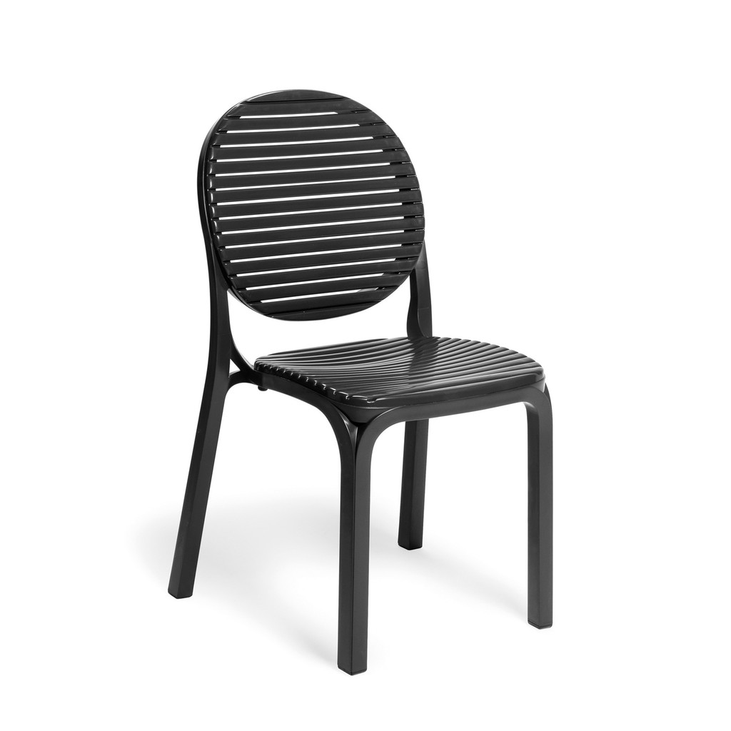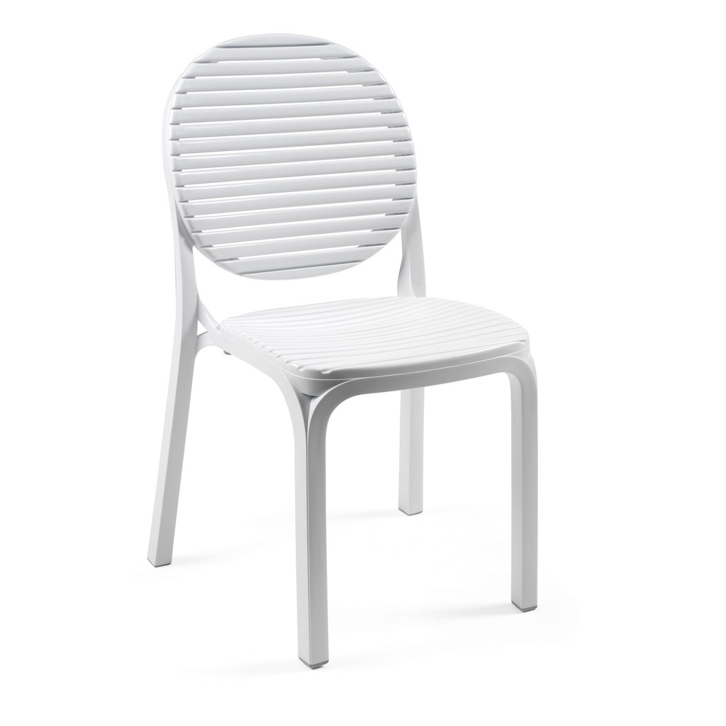 Sedia senza braccioli in polipropilene, impilabile, struttura tubolare e gambe con piedino antiscivolo.