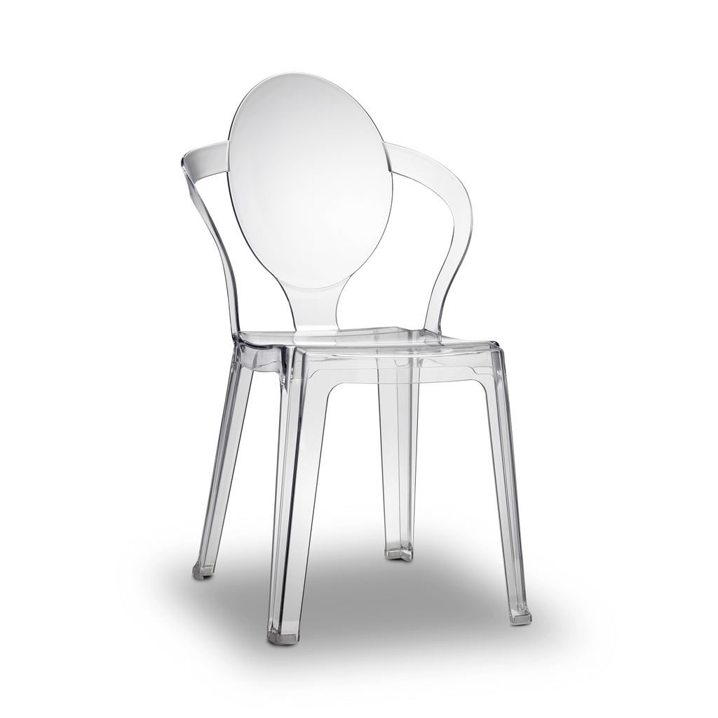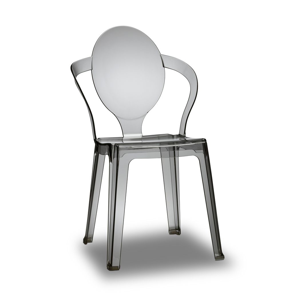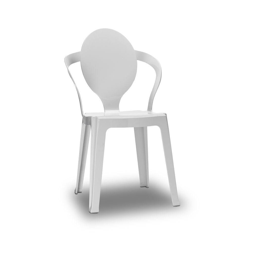 Struttura in policarbonato. Caratterizzata da uno schienale ovale cesellato da un movimento di forme piene e vuote che dettano un nuovo ritmo al gusto contemporaneo. Un'inedita capacità strutturale, ne permette un'impilabilità praticamente infinita. Per uso interno/esterno, impilabile fino a 20 pezzi.