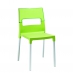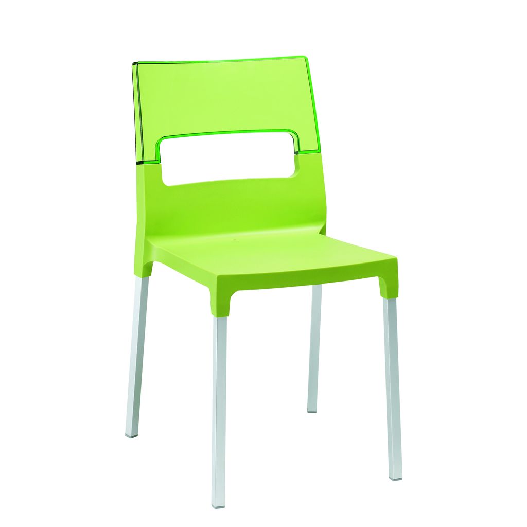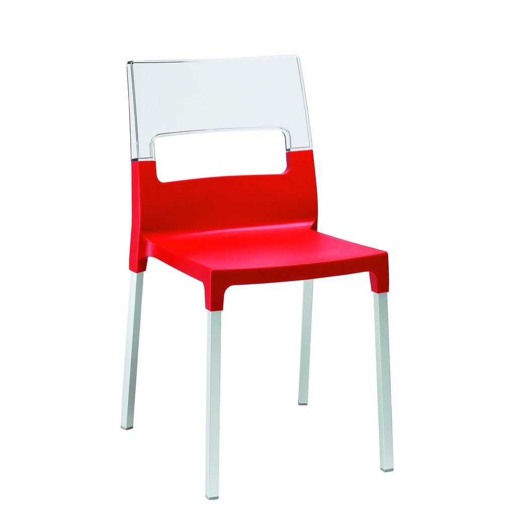 Seduta in tecnopolimero rinforzato con fibra di vetro. Schienale in policarbonato trasparente. Gambe in alluminio anodizzato a sezione quadrata da mm. 22x22. Disponibile in diversi colori. Impilabile. Per uso interno/esterno.