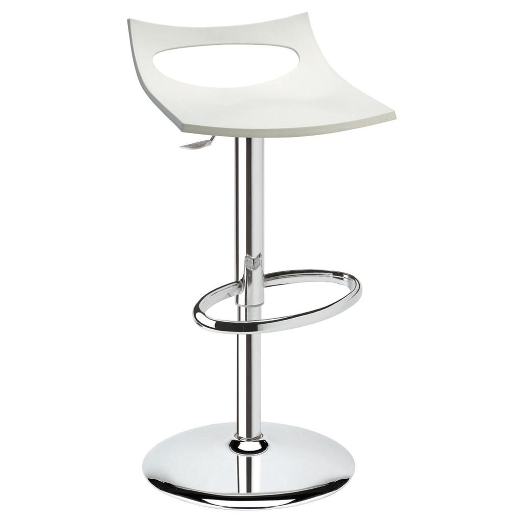 Sgabello girevole regolabile in altezza con pistone a gas. Base e colonna in acciaio cromato. Disponibile anche nella versione con poggiapiedi a U. Sedile in tecnopolimero in diversi colori. Per uso interno. Sgabello Diavoletto: ALT. MAX 92 cm, LAR. 44 cm, PRO. 44 cm, PES. 10,9 kg - Altezza minima 54